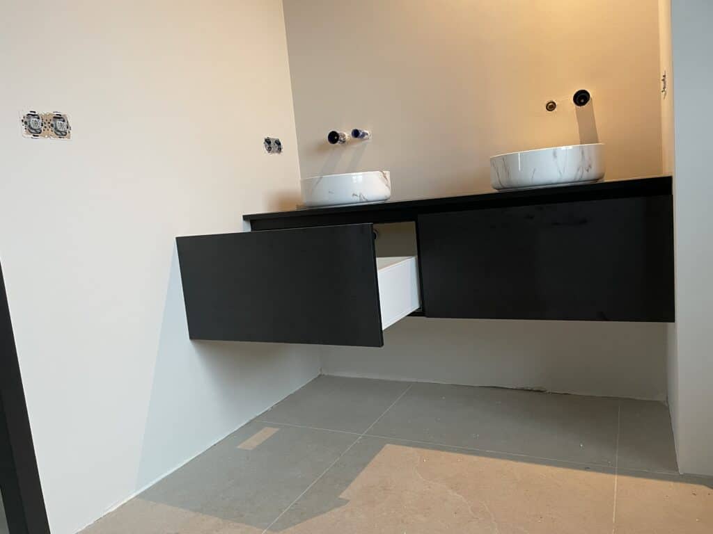 De ruimte tussen de drie muren is optimaal benut met dit prachtige maatwerk meubel. Doordat het vrij van de grond hangt geeft het een ruimtelijk gevoel. Het meubel is afgewerkt met een zwarte kunststof toplaag met houtstructuur. Een prachtig, chique en luxe eind resultaat!