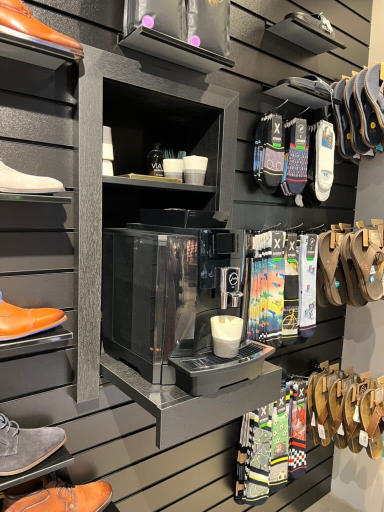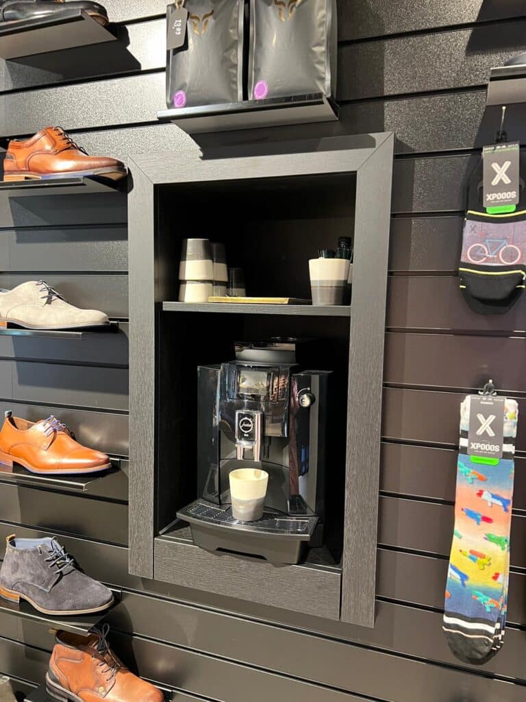 Om de klanten in de winkel een lekker kopje koffie te kunnen aanbieden is er een koffiehoek gemaakt. Dit is een kast met met uittrekbaar plateau in een bestaande nis.