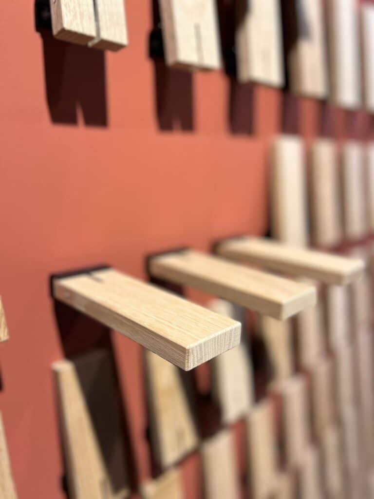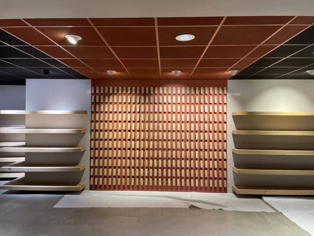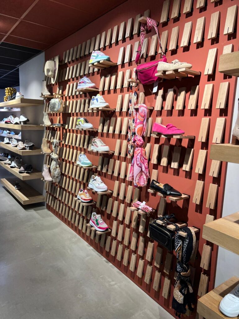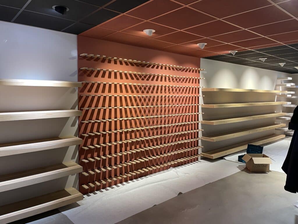 Een grote wand is voorzien van kantelbare schappen. Met dit concept kan er van tijd tot tijd een gevarieerde indeling gecreëerd worden om producten te presenteren.